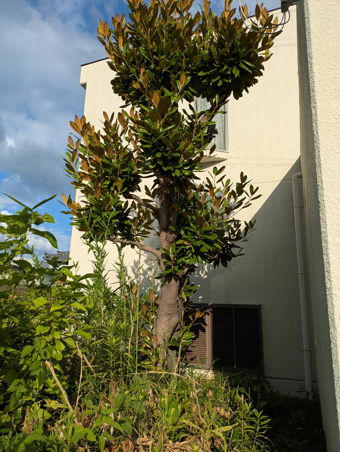 B様邸のタイサンボクは建物のすぐそばに立っており、枝葉が外壁や窓に近づいていました🏠💨
